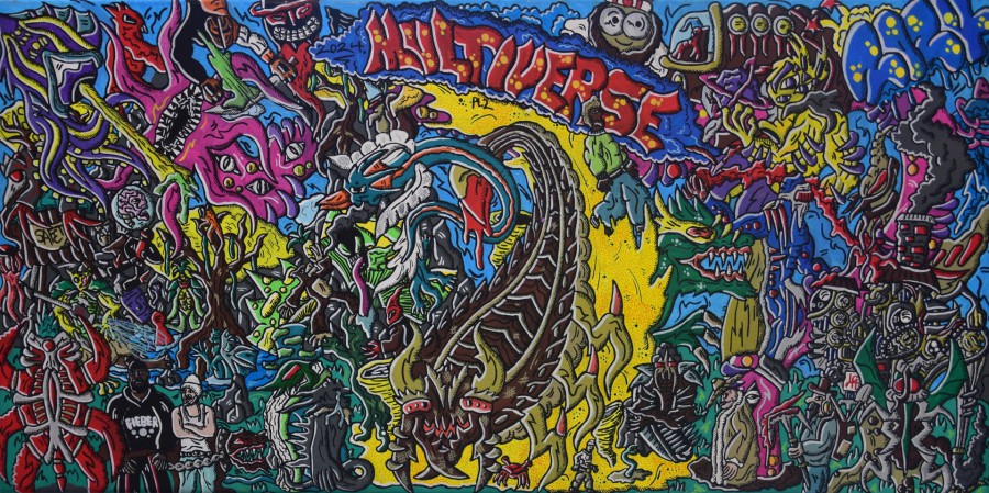 Zwischen Illusion und Auflösung entfaltet sich schließlich in mehreren Werken eine bizarre Welt, puzzleförmig mit mannigfaltigen Versatzstücken aufgebaut, die sich dem Medium des Comics verschrieben haben. Die Vielfalt der Formen, Gestalten und Existenzen dieser Welt, die keineswegs vom Menschen dominiert wird, überrascht. Dargestellt wird keine heitere, eher eine düstere Welt, so dass sich die Frage nach der Zukunft ins Bewusstsein drängt.