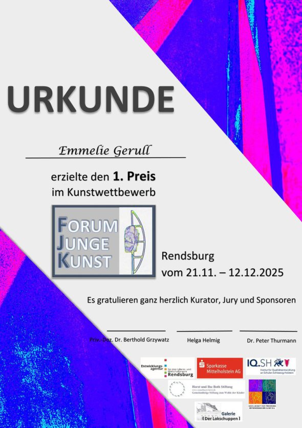 Forum Junge Kunst in Rendsburg. Das Forum Junge Kunst bietet künstlerisch-kreative Schülerinnen und Schüler der Oberstufe an Gymnasien, Gemeinschaftsschulen und berufsbildenden Schulen des Landes Schleswig-Holstein mit dem Lokschuppen in Rendsburg eine zentral gelegene und professionelle Ausstellungsmöglichkeit und richtet den Forumkunstpreis aus. Schülerinnen und Schüler können erste Erfahrungen mit der öffentlichen Darstellung eigener Werke machen und die Öffentlichkeit erlebt das Kreativpotential der jüngeren Generation, so dass ein generationenübergreifender Diskurs über aktuelle Kunst und ihre Inhalte angeregt wird. https://www.berthold-grzywatz.de/forum-junge-kunst/