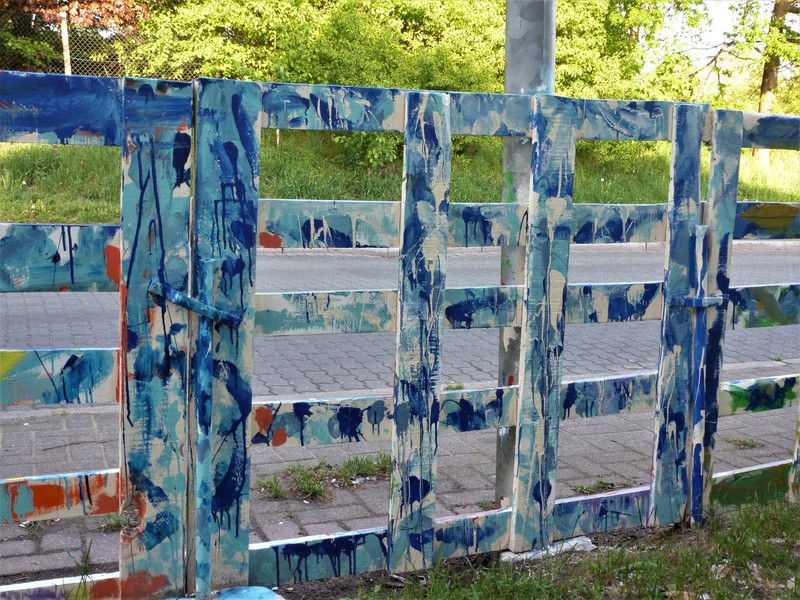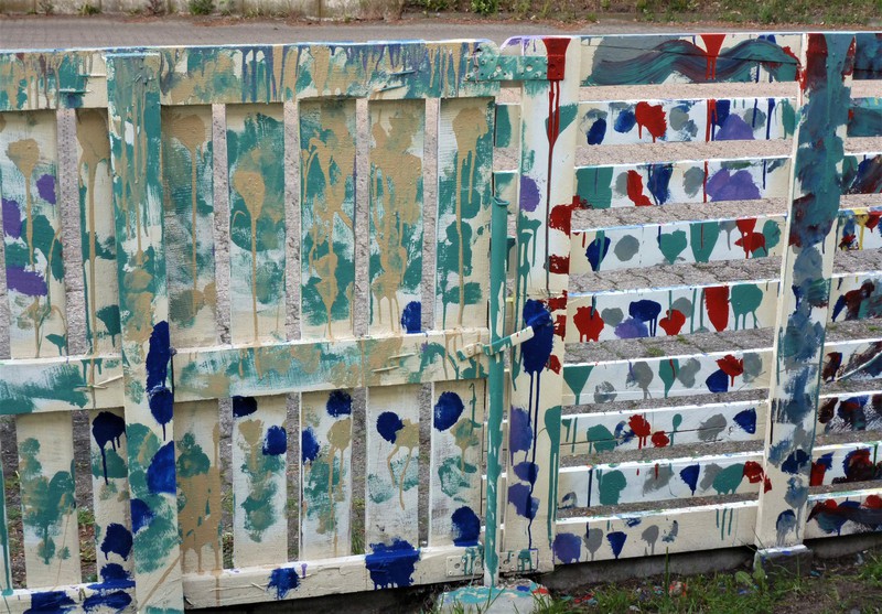 Das Projekt „Die verrückte Kleckserei“ hatte es sich zum Ziel gesetzt, Schülerinnen und Schüler im Alter von 7 bis 10 Jahren auf natürliche und aktionsbetonte Weise in Form eines Action Paintings mit Formen moderner Malerei vertraut zu machen und im Ansatz eine Sensibilität für Farben zu vermitteln. Für diesen Zweck stellte die Galerie einen Palettenzaun zur Verfügung, der von der Firma HaGe Port gesponsert wurde. Der Zaun wurde von mir als dem Betreiber der Galerie in Eigenarbeit installiert und für das Action Painting vorbereitet, d. h. geschliffen, grundiert und mit einer Basisfarbe versehen.