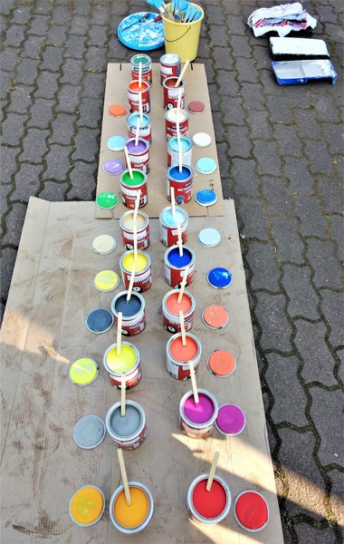 An den nach Klassen eingeteilten Aktionstagen wurden die Schüler jeweils in Zweiergruppen aufgeteilt. Jede Gruppe erhielt zwei Farben und jeweils ein Palettensegment als Aktionsfeld. In einem ausgewählten zeitlichen Rhythmus wurden die Farben erst in der Gruppe und anschließend jeweils von Gruppe zu Gruppe gewechselt, so dass von den bereitgestellten 22 Farbtönen ein Großteil in jeder Gruppe zur Verfügung stand.