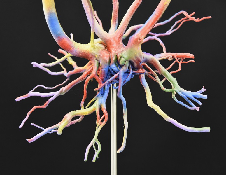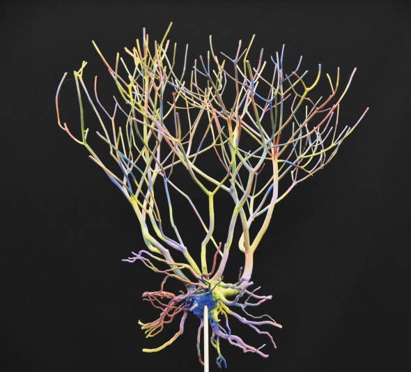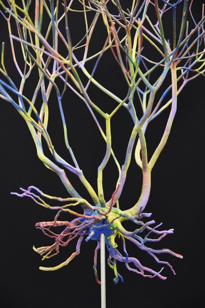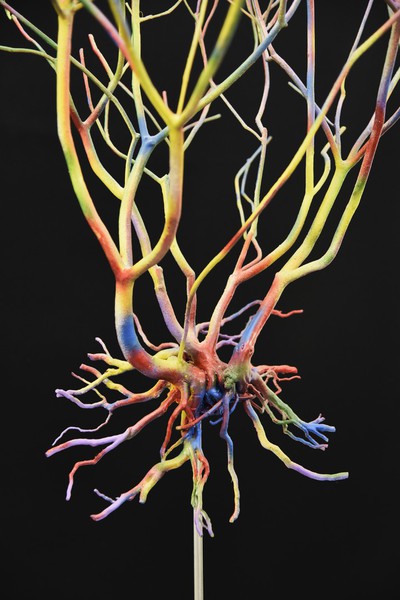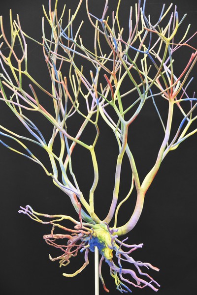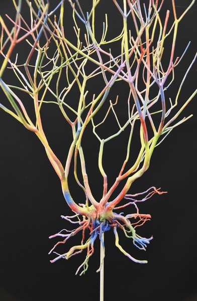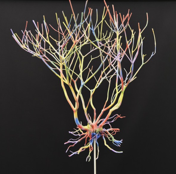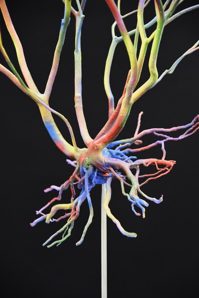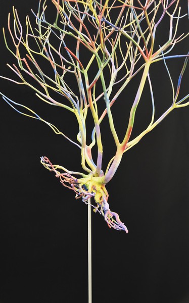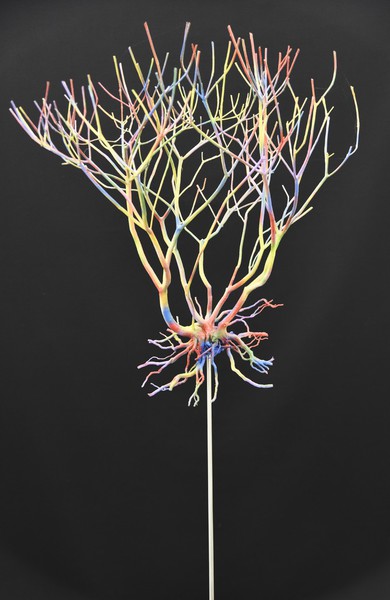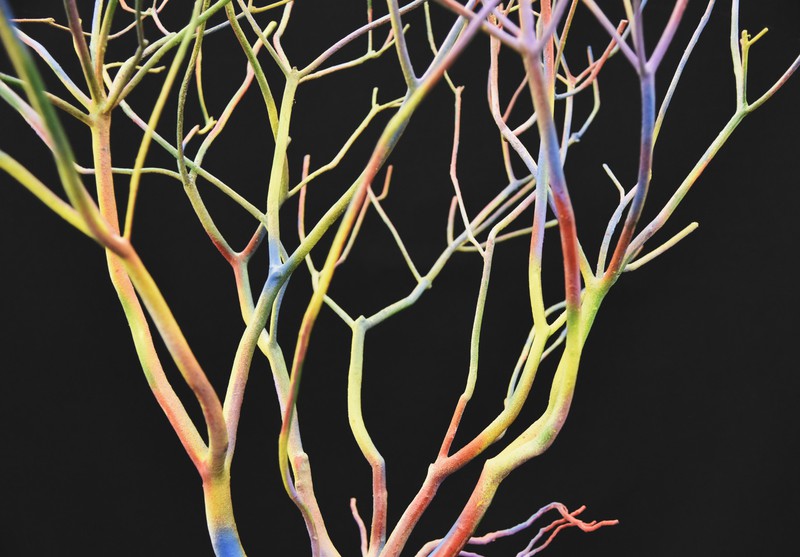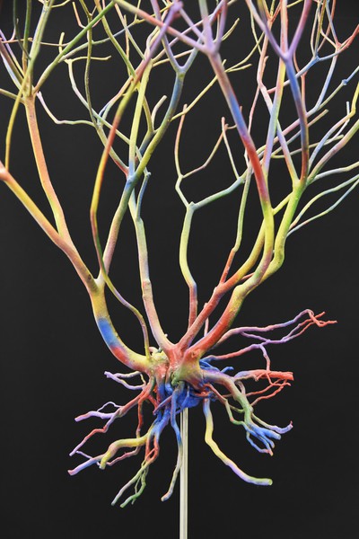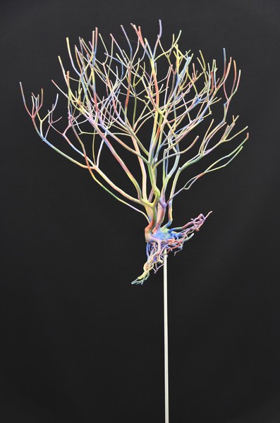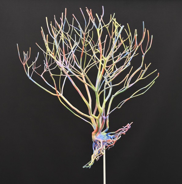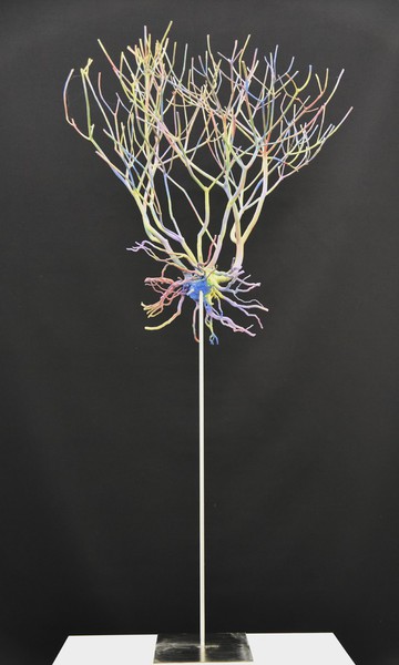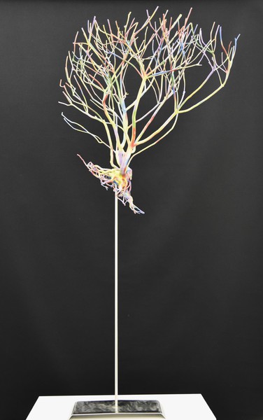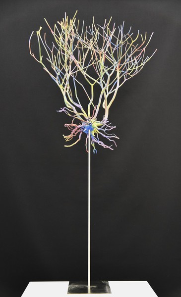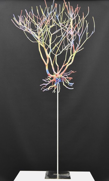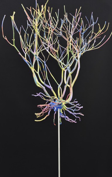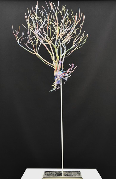 Rhododendronholz, geschliffen und verschieden farbig gelackt. Edelstahl, poliert, an der Basis mit abgeschrägten Flanschen. 185 x 90 x 70 cm.
